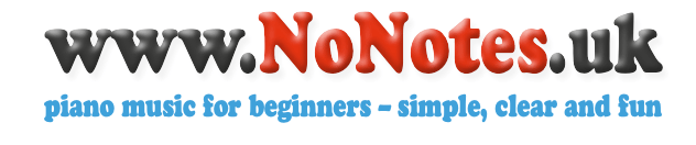 The goal of No Notes piano music is that beginners learn to play the piano with the same control and expression as when they sing, hum or whistle. No Notes‘ simplicity does not only mean that absolute beginners can play an attractive variety of familiar music, assimilating foundation keyboard skills as they go. It also means that it’s easy for two (or more) absolute beginners (e.g.  parents or friends, and also in group keyboard sessions) to play No Notes pieces as duets – half as hard and twice as much fun!